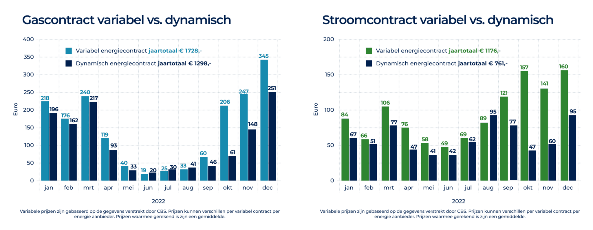 Het onderzoeksrapport toont aan dat het prijsverschil voor stroom het grootst was in de maanden oktober en november (respectievelijk 110 euro en 81 euro). In augustus was het dynamische stroomcontract duurder dan het variabele contract. De stroomprijzen waren op dat moment hoog, door het aanvullen van de gasvoorraden. Op het gebied van gas blijkt uit de cijfers dat in negen van de twaalf maanden in 2022 huishoudens met een dynamisch gascontract voordeliger uit waren dan wanneer zij een variabel contract hadden afgesloten. In de drie maanden dat de kosten hoger uitvielen (juni, juli en augustus), werd het prijsverschil volgens de onderzoeker veroorzaakt door het aanvullen van de gasvoorraden.